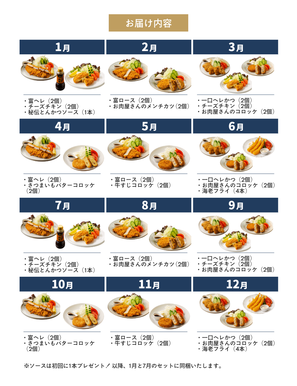 とんかつ、惣菜、フライ、秘伝ソースまで人気商品を揃え、各月ごとに決まったラインナップをご用意しています。